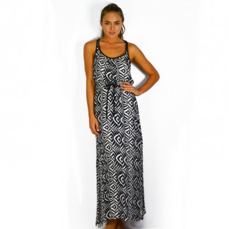 BAKU CHINTARIA MAXI DRESS (C185CHN). flattering fit for all shapes; scoop neck with pleat detail; adjustable draw tie waist; side split detail; lightweight polished rayon; back detail