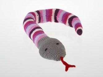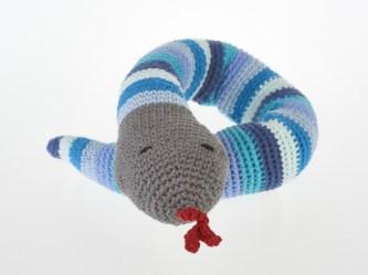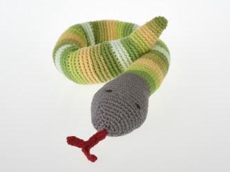 Our new green snake baby rattles are crocheted from cotton yarn (our previous lines were knitted). These green snakes make fabulous baby toys as they are easy for your baby to grasp onto and explore. The gentle rattle sound is stimulating for your baby.