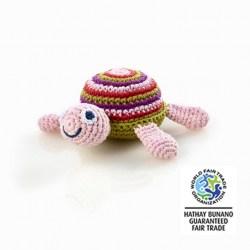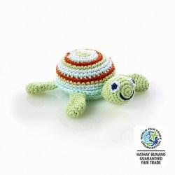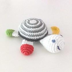 Our lovable turtle baby toy is a best seller with its striking pastel green, blue and red stripes and sweet smile. This handmade cotton turtle rattle is perfect for tummy time.