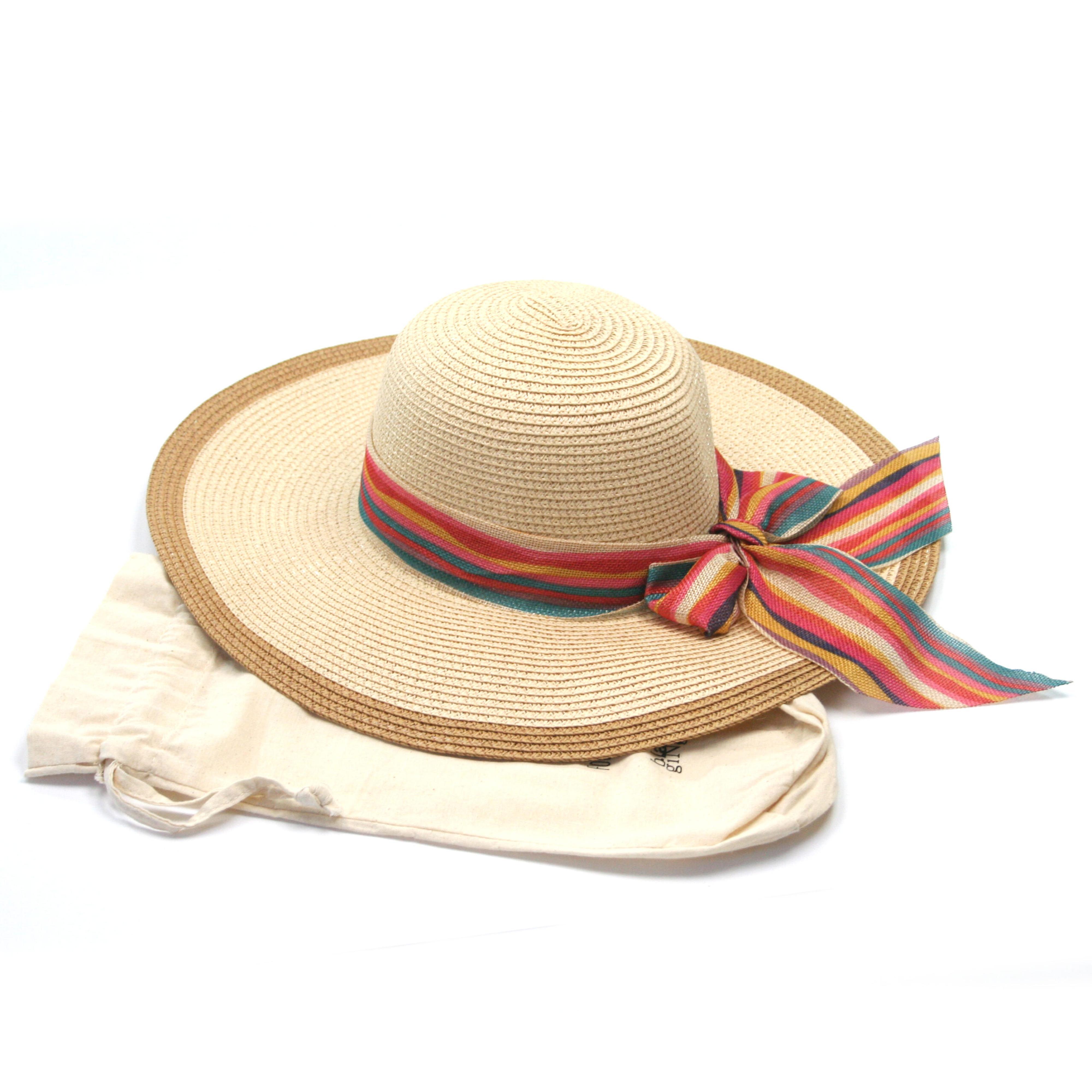 Large Brim Natural Hat with Rainbow Band - Foldable (with Bag)