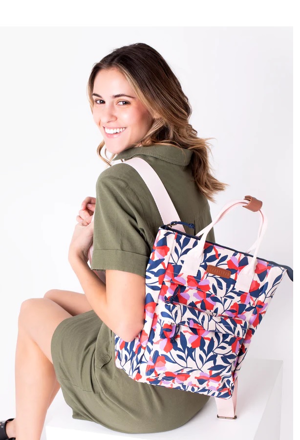 Functional and stylish, this floral print backpack not only has adjustable shoulder straps, it also has short handles that pop together for easy carrying. It's zip close with two internal pockets, and it has a hard-to-spot covered zip pocket behind the traditional small zip close front pocket.