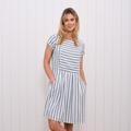 Our new shape woven stripe dress features a classic stripe on a lightly texture fabric. With side entry pockets, capped sleeves and box pleats under the waistband, this dress has a beautifully feminine feel.