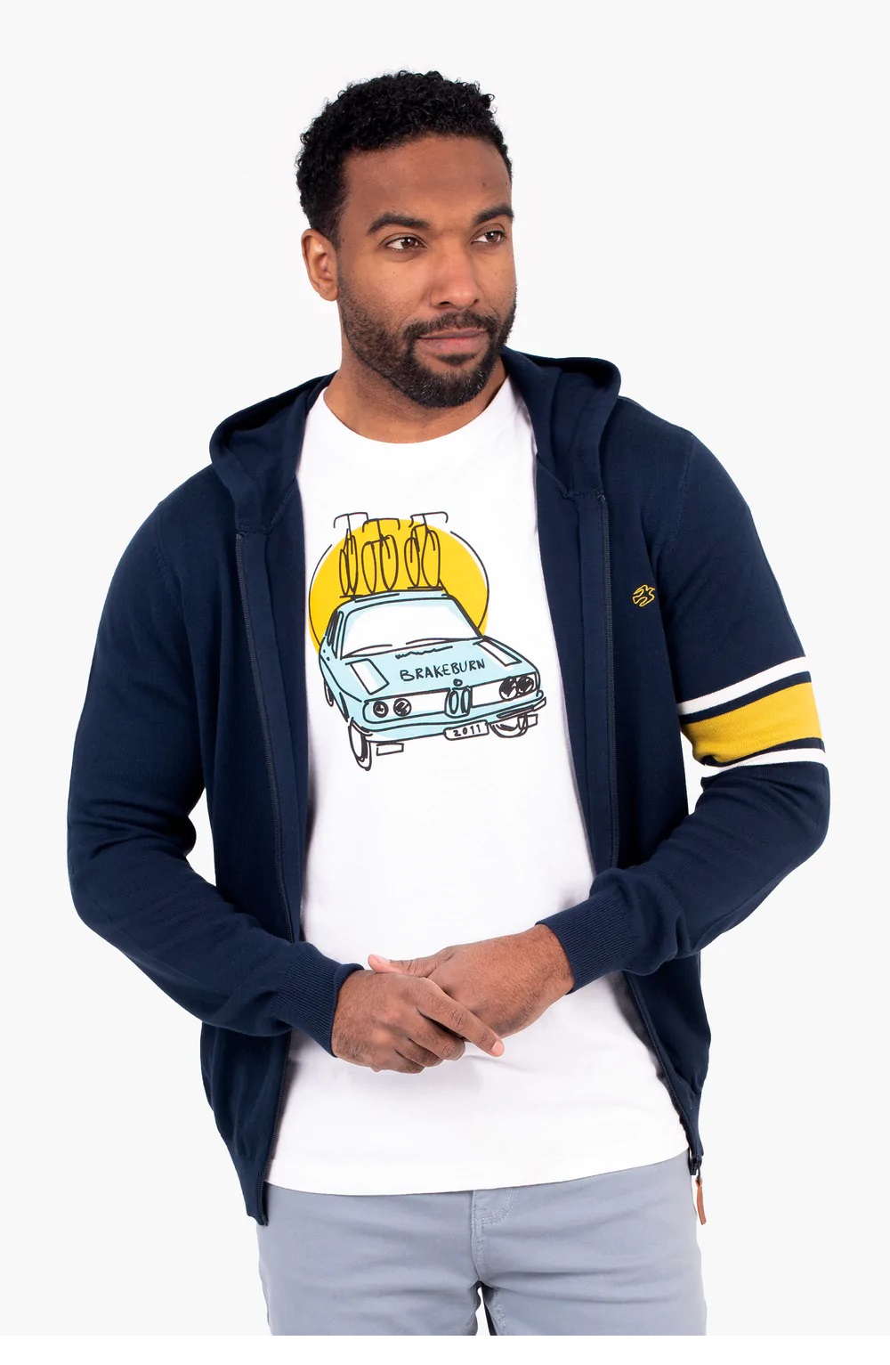 Lightweight sweaters are the heroes of changing seasons and this fine knitted men's drawstring hoodie is no exception. Ideal for cool weather it features ribbed cuffs and hem, a full length zip and stripe sleeve detail.