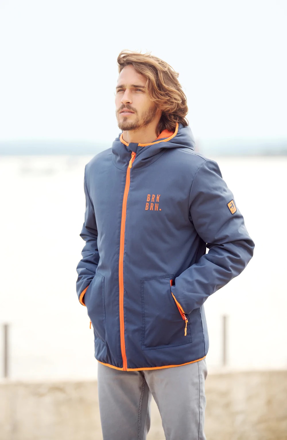 Keep warm in style wearing this men's insulated jacket. Ideal for post-sea sports, this zip through jacket has a soft borg lining for ultimate comfort. It features a full lenth zip, two front pockets, elasticated cuffs, an elasticated hem and a hood and it's finished with stylish orange detailing in the zips, lining, and Brakeburn logo.