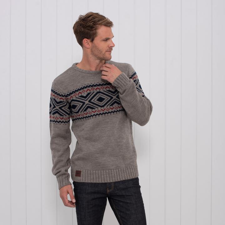 A classic cut crew neck cotton knit in. In traditional light grey with navy and red knitted detailing the crew neck knit includes embroidered Brakeburn logo.