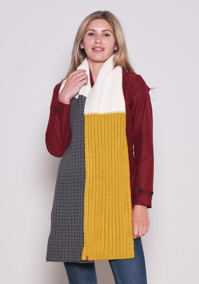 A colour block knit scarf is a must-have when autumn and winter arrive. Be bold and add it to your collection for effortless style and super-cosiness. Worn with your favourite sweatshirt, jeans and boots, you'll soon wonder what you did without it. This scarf contains a mix of knit constructions on the different colour blocks to keep you extra warm.