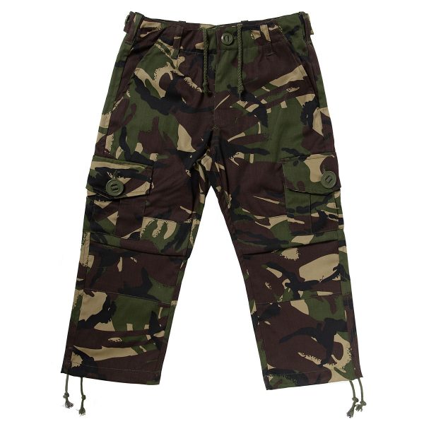 Kids Army Trousers in woodland camouflage, Remain unseen by your enemies with these great army Camouflage Trousers. And with 6 pockets, there’s plenty of room to carry your essential kit. All trousers have a pull cord at the waist and ankles plus a button waist adjuster either side.