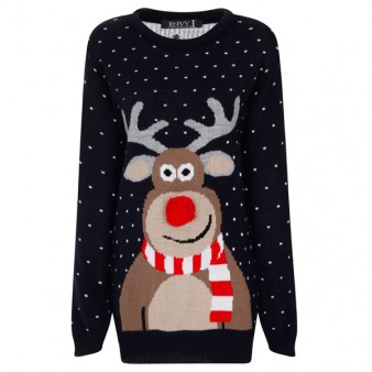 UNISEX NAVY BLUE NOVELTY KNITTED CHRISTMAS JUMPER. FEATURING A JACQUARD PATTERN REINDEER IN A SCARF WITH 3D RED POM POM NOSE.