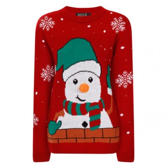 UNISEX RED NOVELTY KNITTED CHRISTMAS JUMPER. FEATURING A JACQUARD PATTERN WITH A SNOWMAN IN A SCARF AND A 3D ORANGE KNITTED CARROT NOSE.