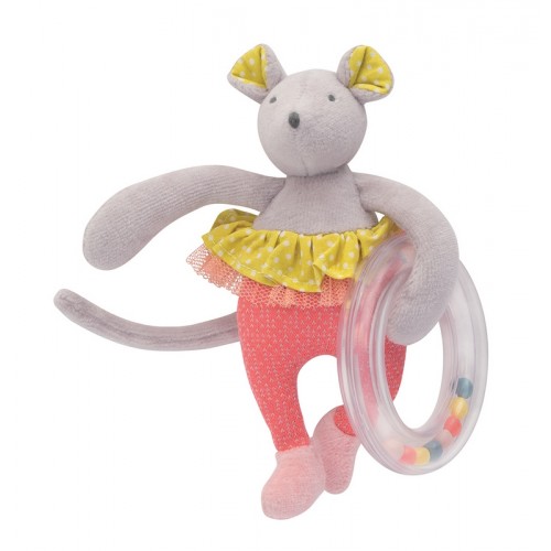 Little Opera mouse in a tutu with plastic ring of coloured beads, detachable. Awakens baby's interest and develops baby's ability to grasp objects.