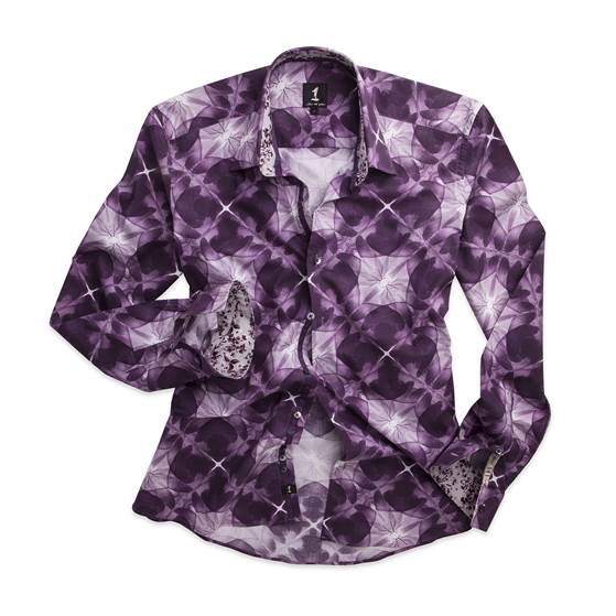 This shirt features an abstract feather repeat print in plum hues. Details include contrasting fabric lined cuffs and inner collar stand as well as smokey Mother of Pearl buttons and our unique printed tapes. Individually numbered and limited to 500 pieces.