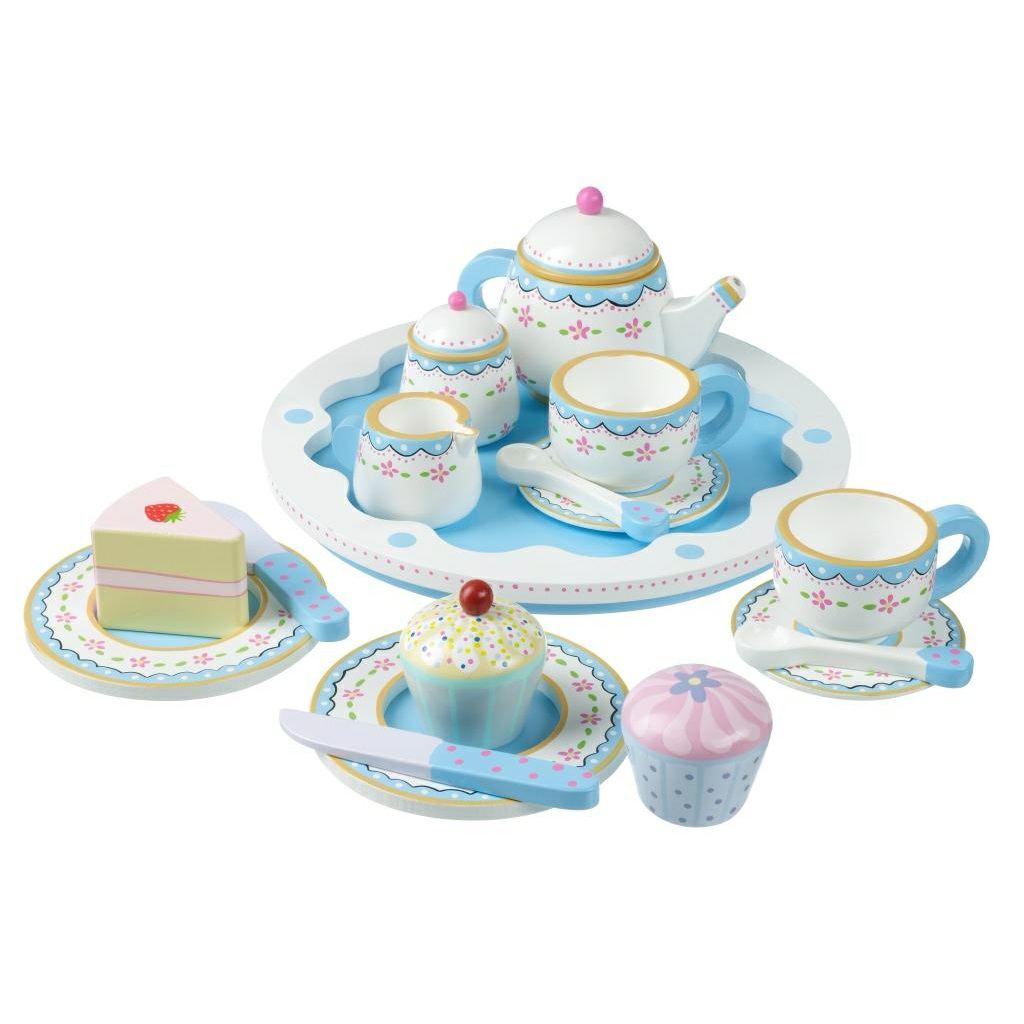 It includes a tray, teapot, milk jug, sugar pot, two teaspoons and two cups and saucers (cake not included).