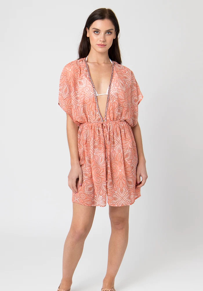 The Rhodes Dress by Pia Rossini features a stunning geometric floral print against a beautiful coral backdrop. The drawstring waistline means this kaftan can be sized to suit your shape, the perfect bikini cover up.