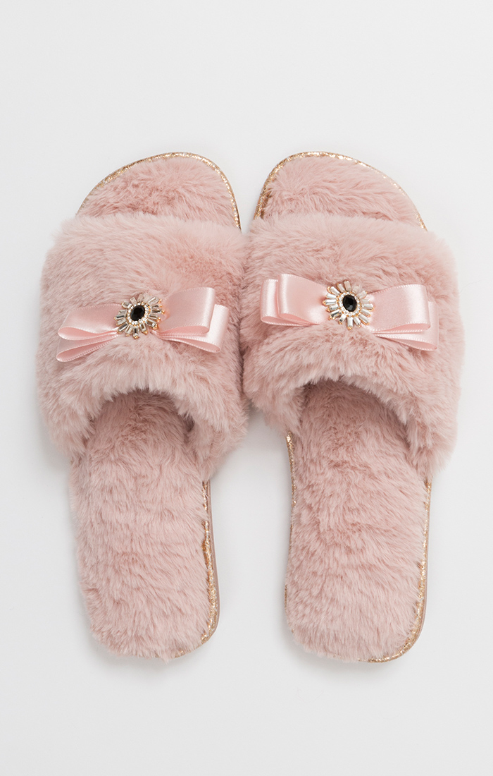 Slip into the season in style with these super cosy faux fur, open-toe slippers. Embellished with a chic jewel and bow, Emma is an irresistibly cute indoor shoe. Available in blush and honey.