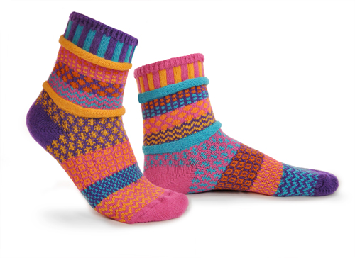 Colours in this sock: fuchsia purple turquoise yellow orange